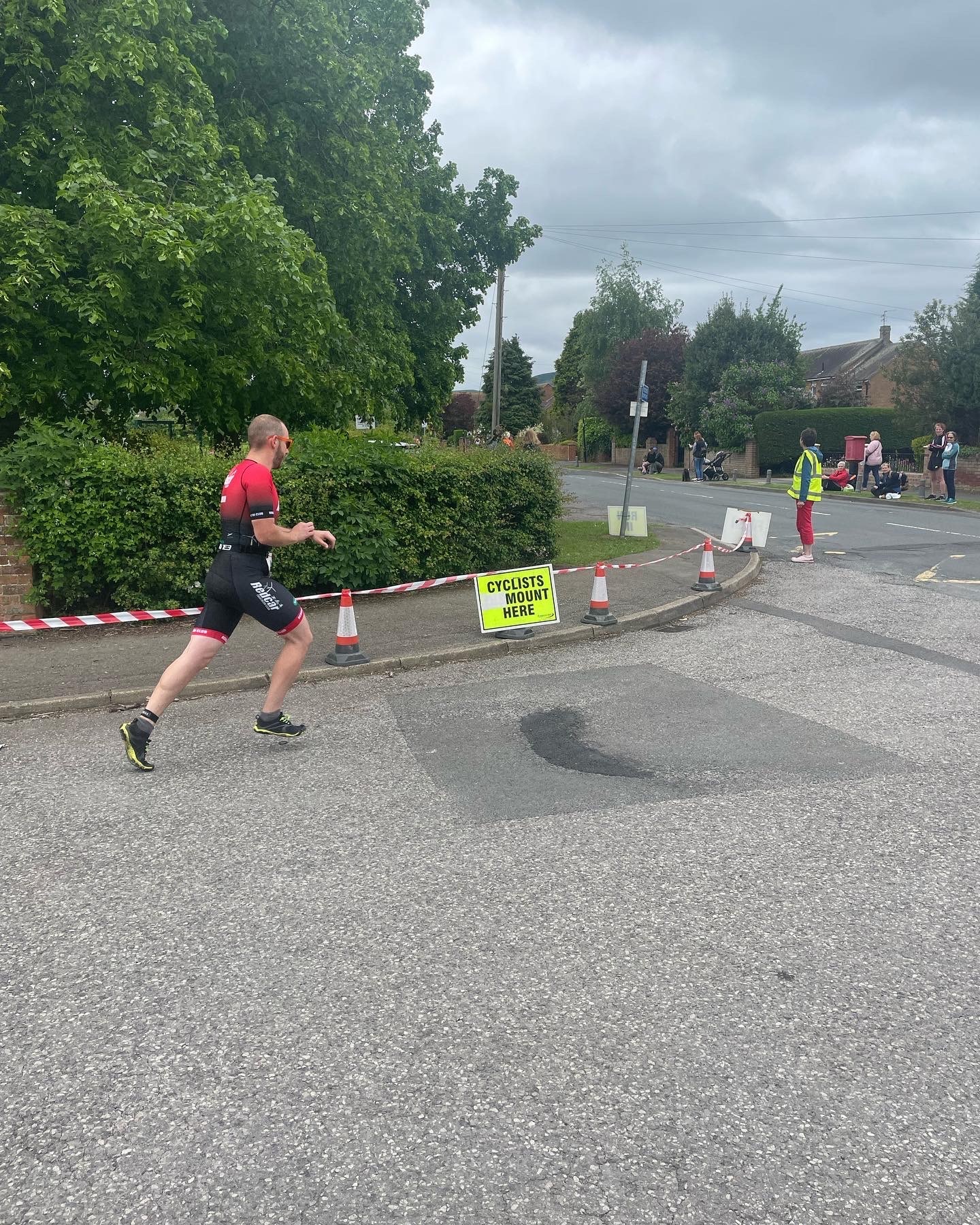 Transition went smoothly. Squeezed a gel in, socks, shoes, race belt and helmet on and off. Managed a jump onto the bike whilst running fairly successfully. Pedals were in the wrong place, forgot to put them back after moving my bike, but clipped in and off I went. I had done the course a couple of times, so knew what to expect, uphill and some grinding for the first half then fast and downhill for the last. Pretty uneventful bike ride. I was overtaken by 2, and I overtook a couple of others, so I was pretty happy. Course was well signposted and marshalled. Great little boost to see some Redcar folk marshalling around the course and getting a cheer.